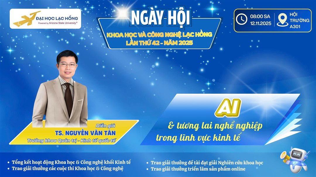 Tại Ngày hội Khoa học và Công nghệ Lạc Hồng lần thứ 42 – năm 2025, thầy sẽ mang đến chủ đề hấp dẫn "AI và tương lai nghề nghiệp trong lĩnh vực kinh tế”.