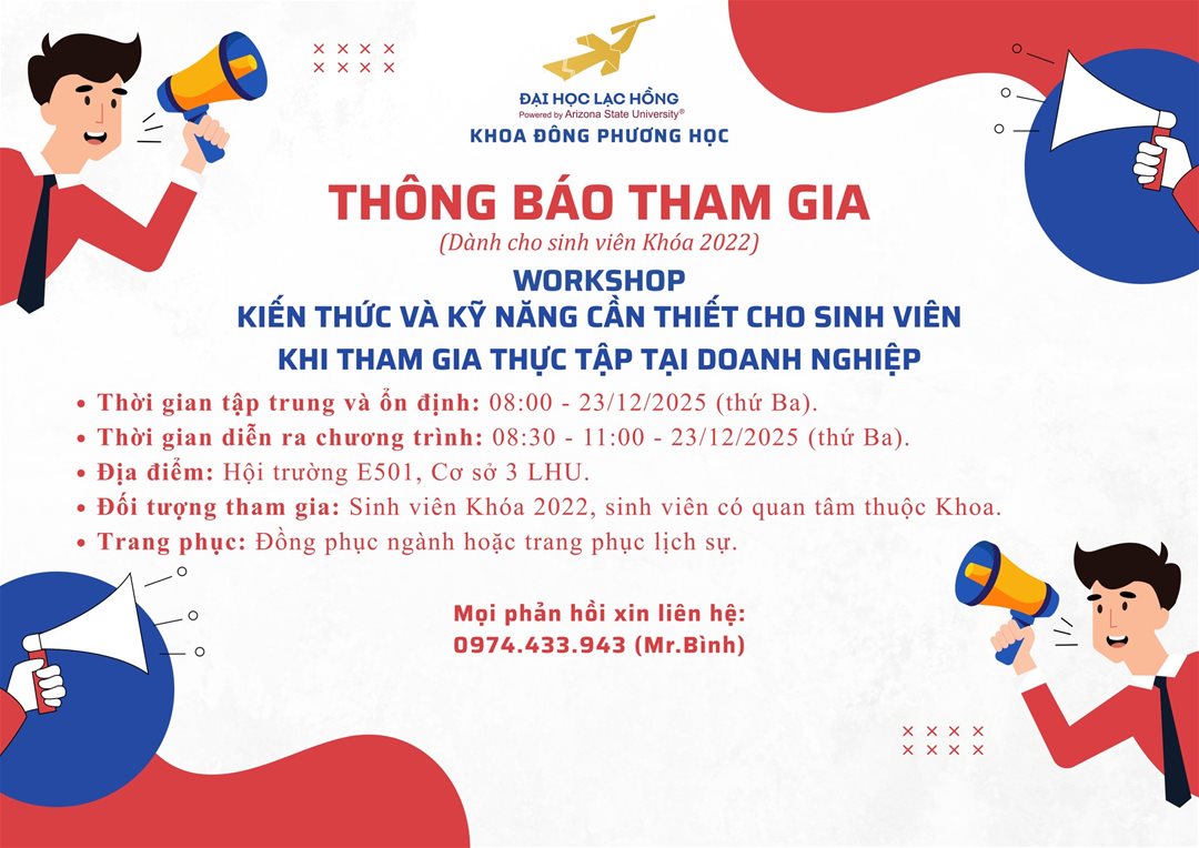 Nhằm chuẩn bị thật kĩ lưỡng cho sinh viên năm cuối (khóa 2022), Khoa Đông phương học trân trọng thông báo thông tin về Workshop "Kiến thức và kỹ năng cần thiết cho sinh viên khi tham gia thực tập tại doanh nghiệp".