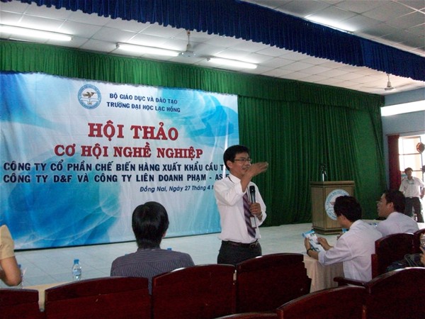 Sáng ngày 27/04/2012 tại giảng đường A301, Trung tâm Quan hệ Doanh nghiệp và Hỗ trợ sinh viên cùng Khoa Công nghệ Hóa – Thực phẩm trường Đại học Lạc Hồng đã tổ chức buổi giao lưu gặp gỡ giữa công ty cổ phần chế biến hàng xuất khẩu Cầu Tre, công ty chế biến thực phẩm D&F và công ty phạm Asset với các bạn sinh viên năm cuối của khoa. Đây là các doanh nghiệp kinh doanh sản xuất nhiều mặt hàng như: các loại bánh, hải sản, trà, các loại thực phẩm chế biến: chả giò, Xíu mại, Há cảo…