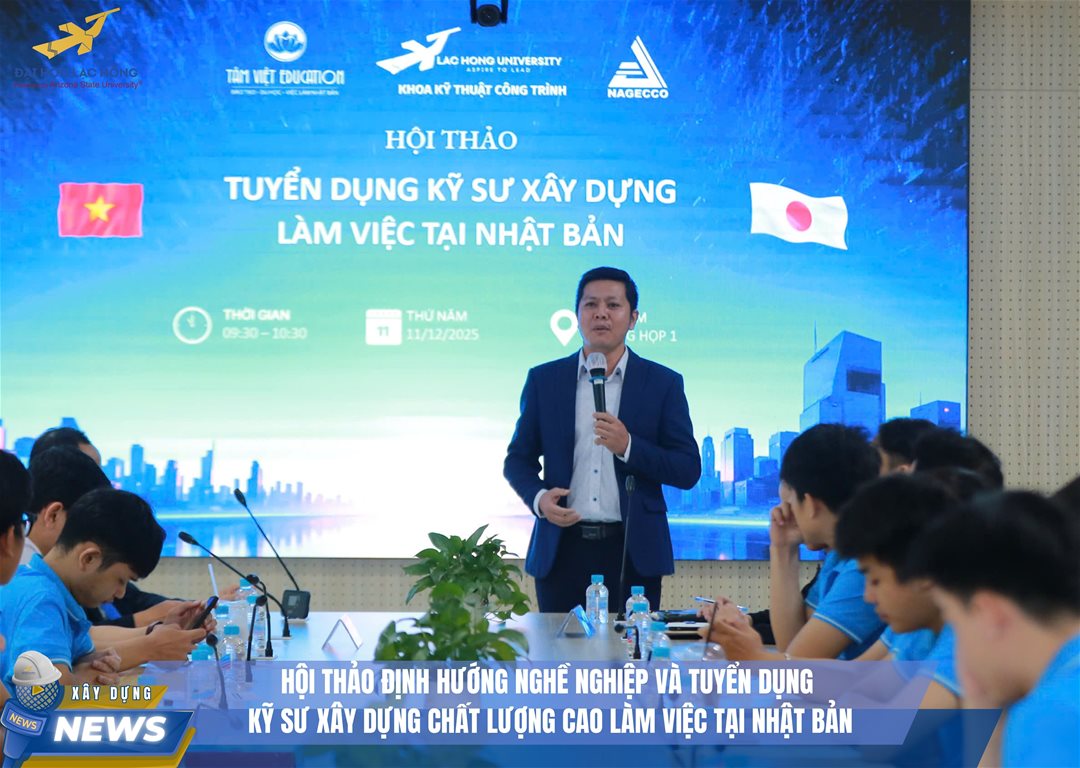Nhằm mở rộng cơ hội nghề nghiệp quốc tế cho sinh viên và đáp ứng nhu cầu nhân lực kỹ thuật chất lượng cao trong bối cảnh hội nhập toàn cầu, Khoa Kỹ thuật Công trình – Trường Đại học Lạc Hồng đã phối hợp cùng Tâm Việt Education tổ chức Hội thảo định hướng và tuyển dụng Kỹ sư chất lượng cao làm việc tại Nhật Bản.