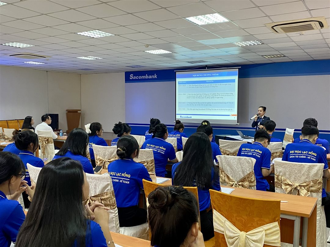On the morning of September 11, 2025, the Faculty of Finance and Accounting, Lac Hong University, organized a field trip and practical training session at the Saigon Thuong Tin Commercial Joint Stock Bank (Sacombank) – Dong Nai Branch for students of Class 24NH111, majoring in Finance and Banking.