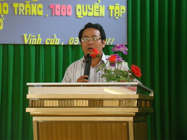 Comrade Truong Hai Thi presenting notebooks to pupils