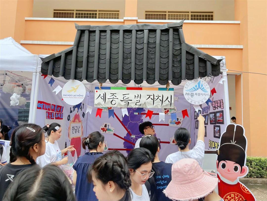 Với chủ đề “Vòng quanh Hàn Quốc”, gian hàng của Lạc Hồng nổi bật nhờ ý tưởng sáng tạo độc đáo, nội dung truyền tải rõ nét văn hóa đặc trưng của Thành phố Sejong đến từ Hàn Quốc, cùng phần thuyết trình đầy cảm xúc và cuốn hút. Không chỉ gây ấn tượng về thẩm mỹ, đội thi còn chú trọng sử dụng vật liệu tái chế, thân thiện với môi trường, gửi gắm thông điệp “Xanh – Sáng tạo – Lan tỏa văn hóa”.